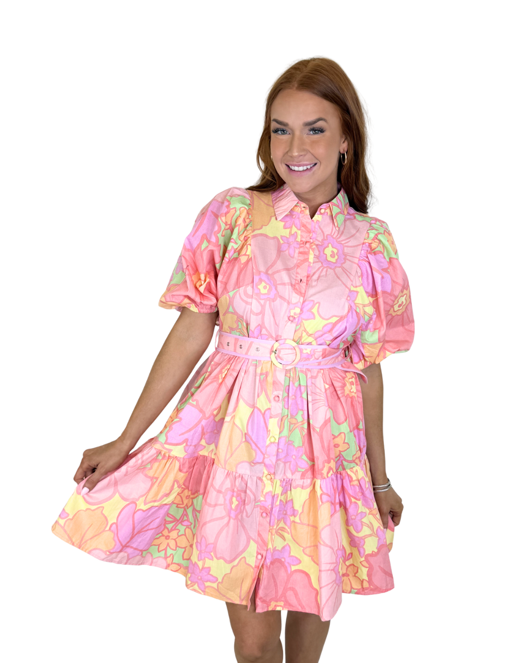 BIG FLORAL PASTEL SHIRT DRESS W//BELT