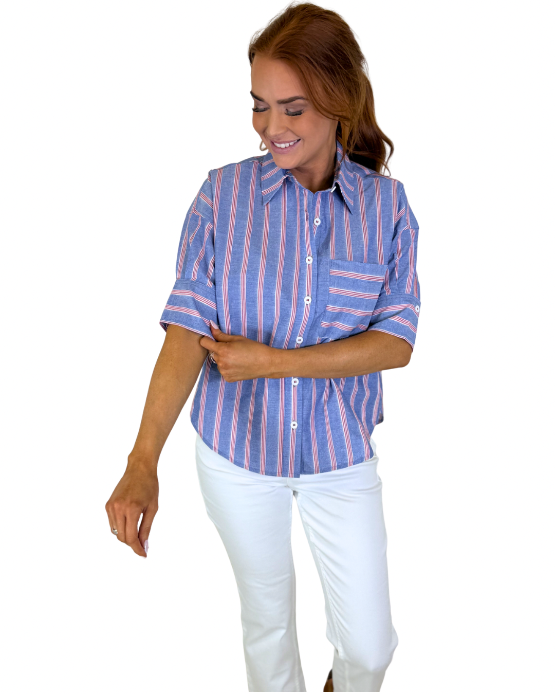 Classic striped button-down top in soft blue with pink accents. Features a collared neckline, front pocket, and roll-tab sleeves for an easy relaxed fit. Lightweight and versatile—perfect for pairing with denim, white pants, or shorts all season long.