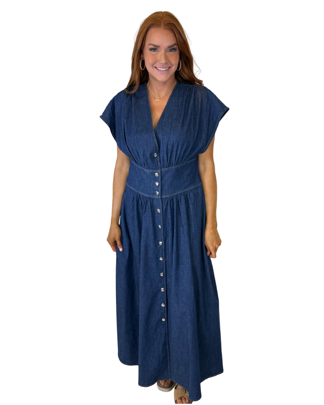 • Effortless and flattering, this denim maxi features a soft drape, button front detail, and a wide waistband that defines your shape. Runs big with a relaxed fit and extra room up top—perfect for my larger chested gals. Easy, comfy, and cute.