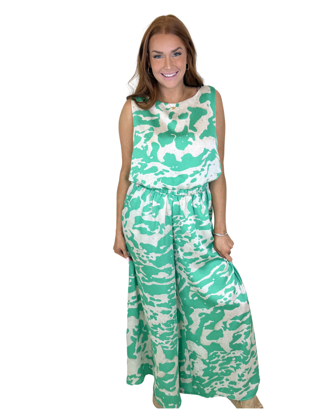 GREEN SATIN PRINTED PANT SET