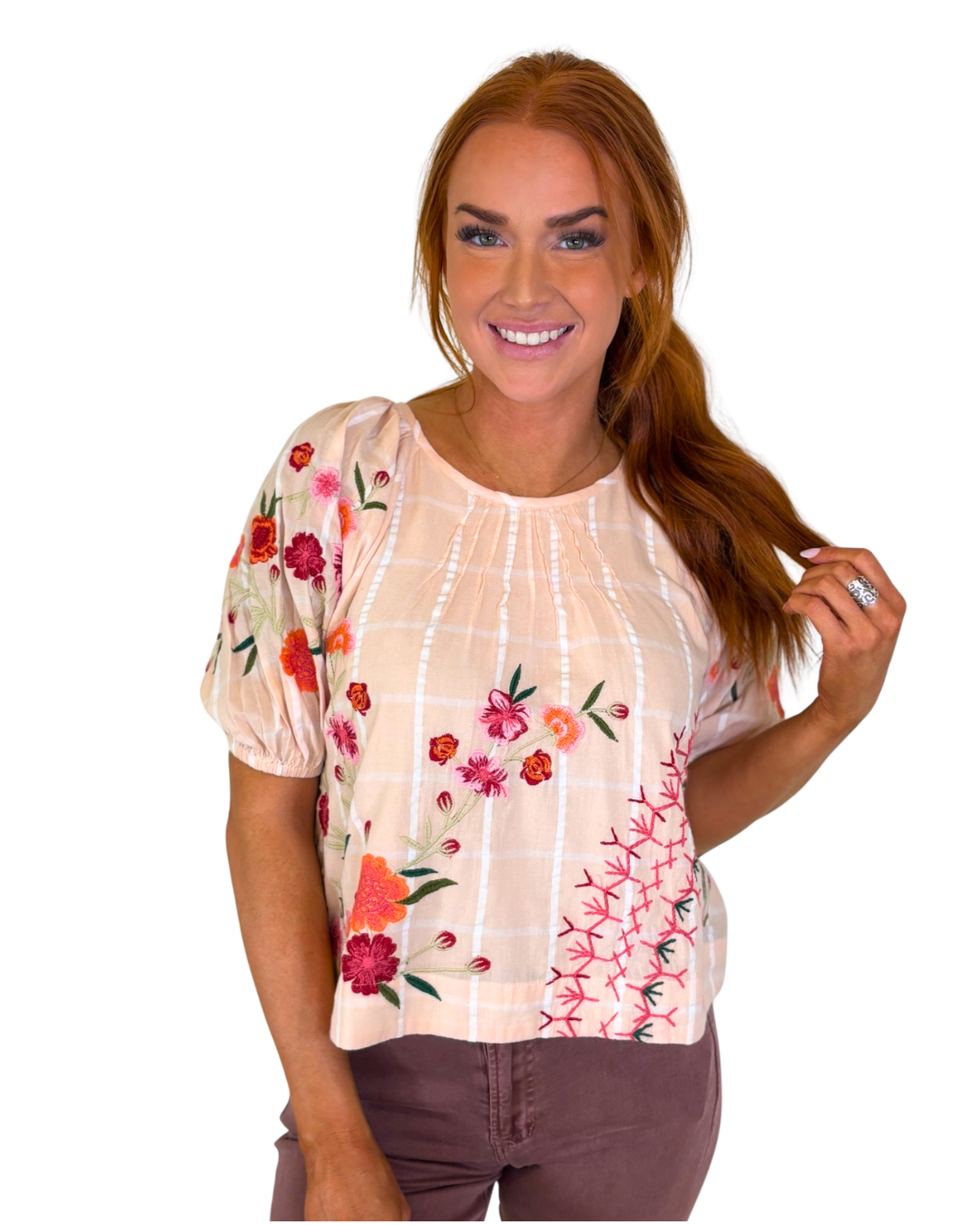• Lightweight blouse featuring delicate embroidery and a soft plaid texture. Designed with a relaxed fit, gathered neckline, and puff sleeves for a feminine touch. Easy to dress up or down!