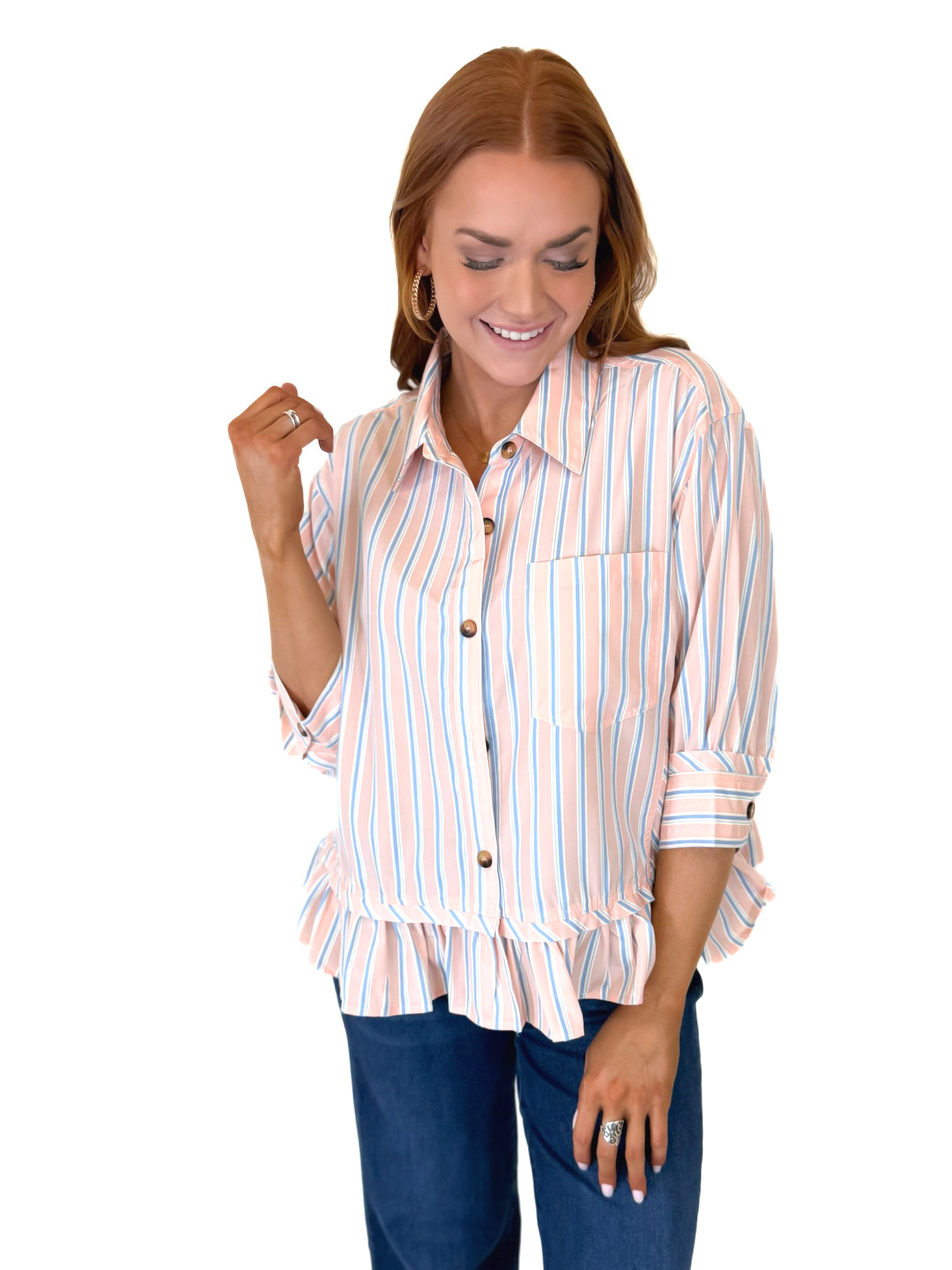 This striped button down top features a relaxed fit with a flattering peplum hem for an easy, feminine silhouette.