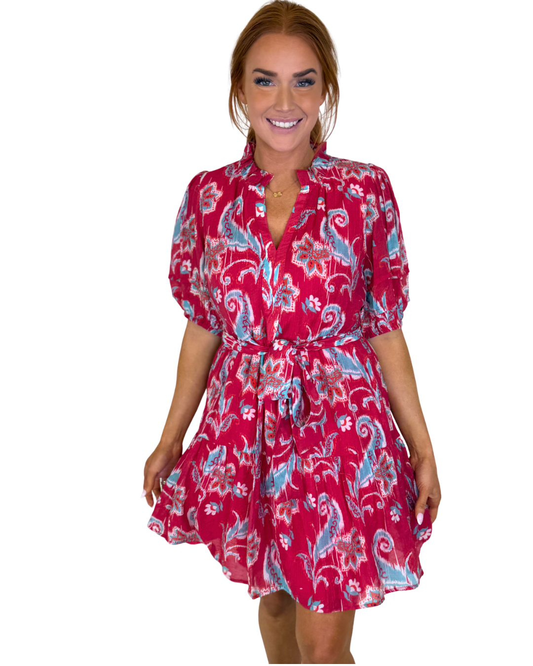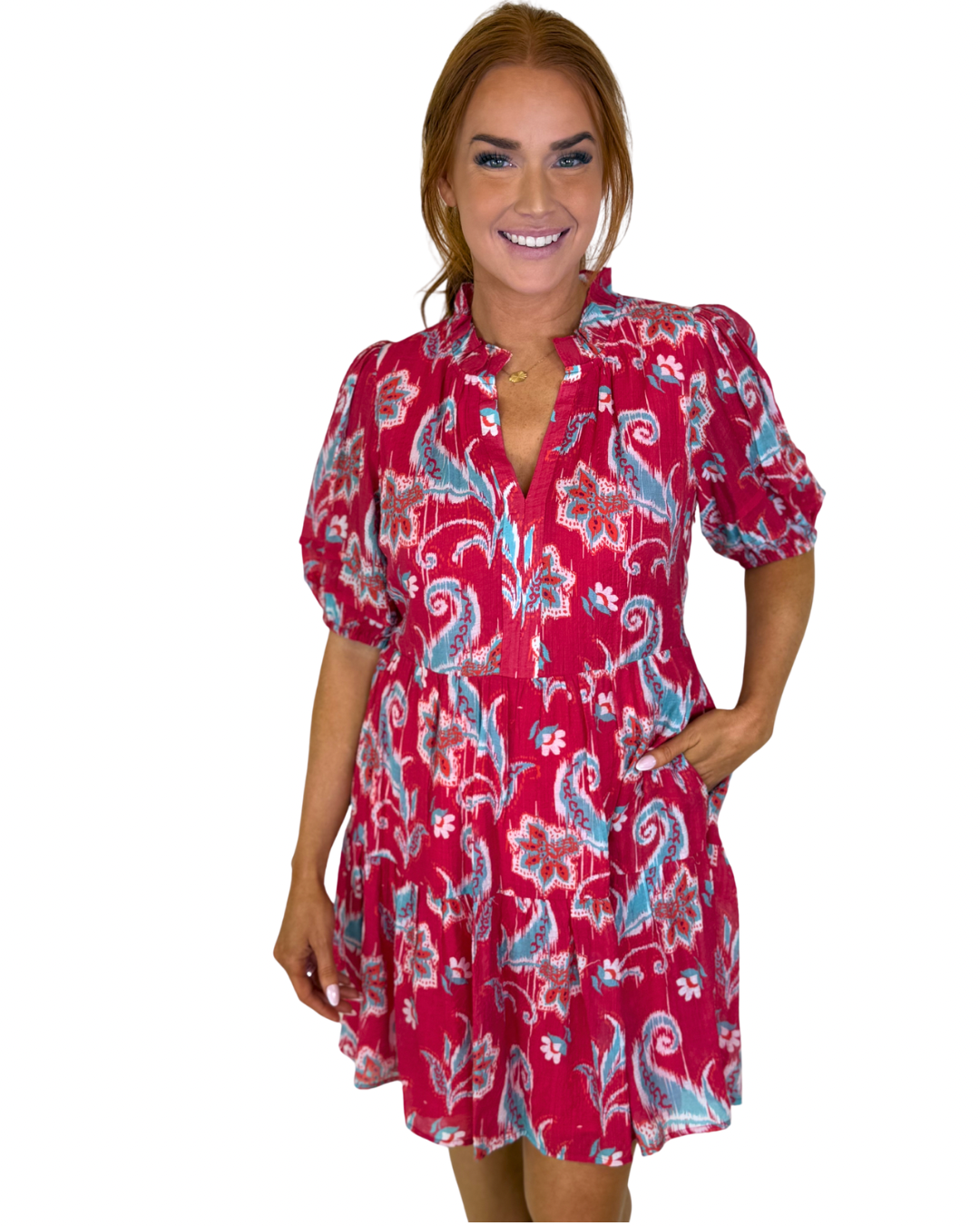 RED WHISPER PUFF SLV TIERED DRESS